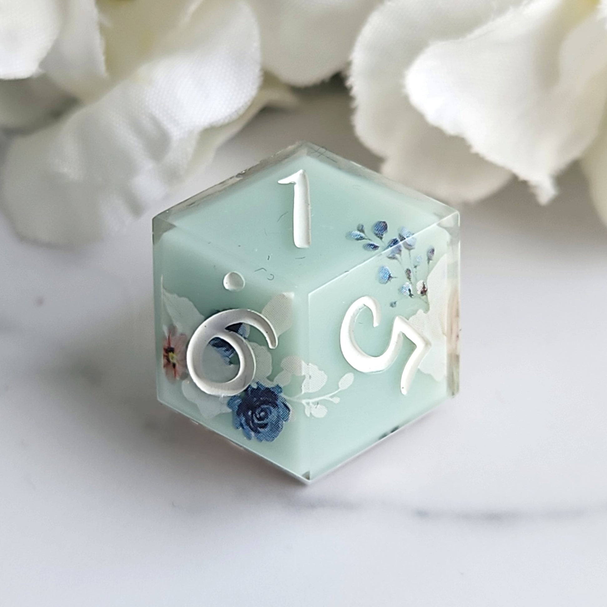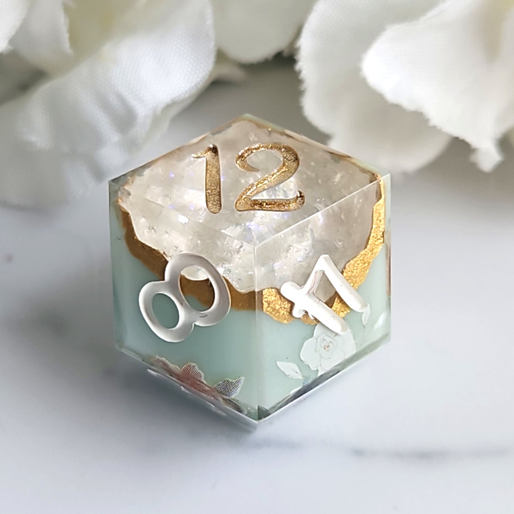 Soft sage/mint green dice blanks decorated with floral decals in shades of pale pink, cream and navy blue and accented with a shimmering white geode core. Finished in a pearlescent white ink with champagne gold trim on the high faces.