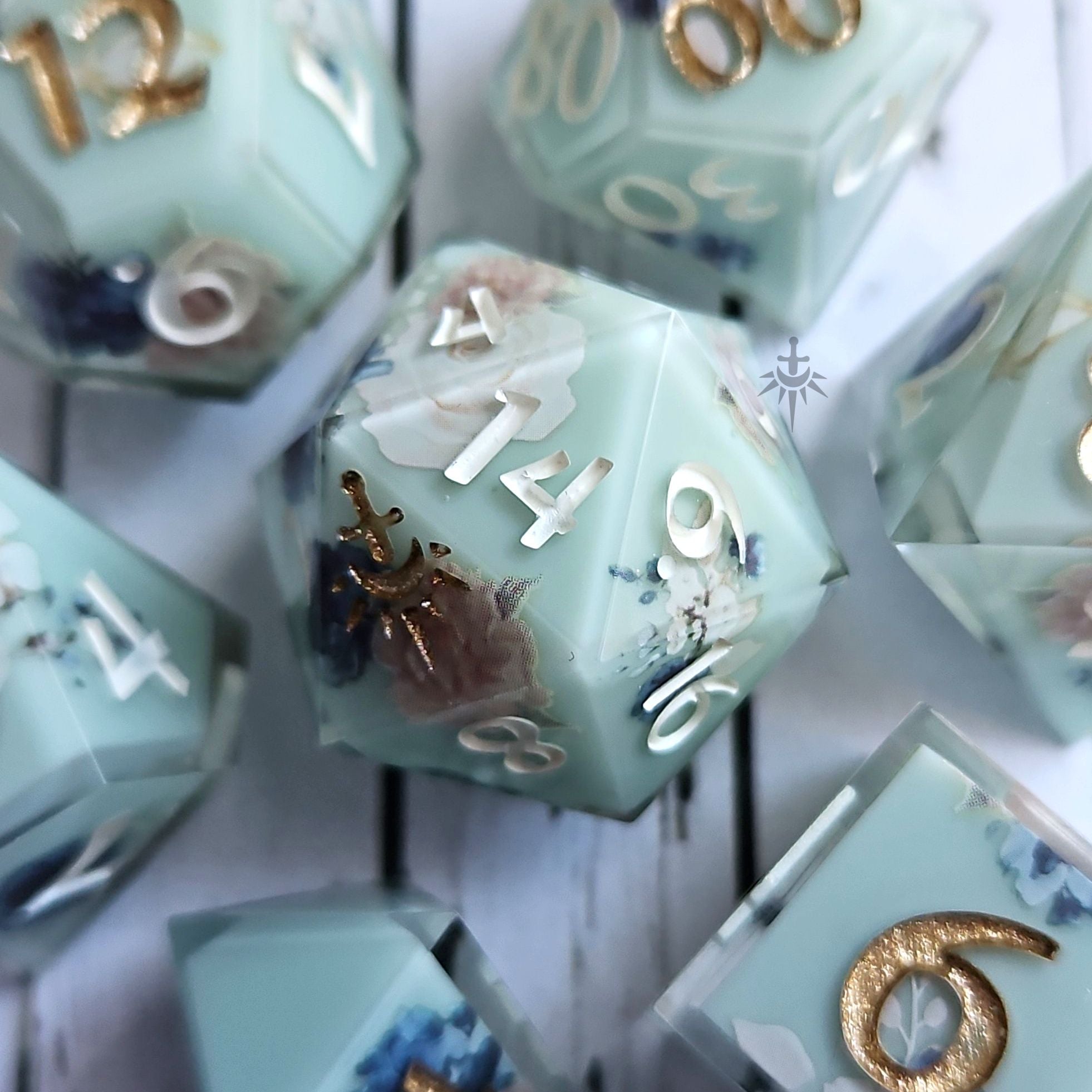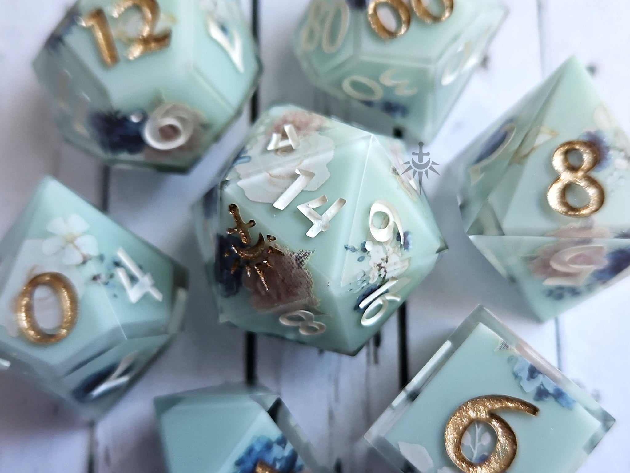 Soft sage/mint green dice blanks decorated with floral decals in shades of pale pink, cream and navy blue. Finished in a pearlescent white ink with champagne gold trim on the high faces.