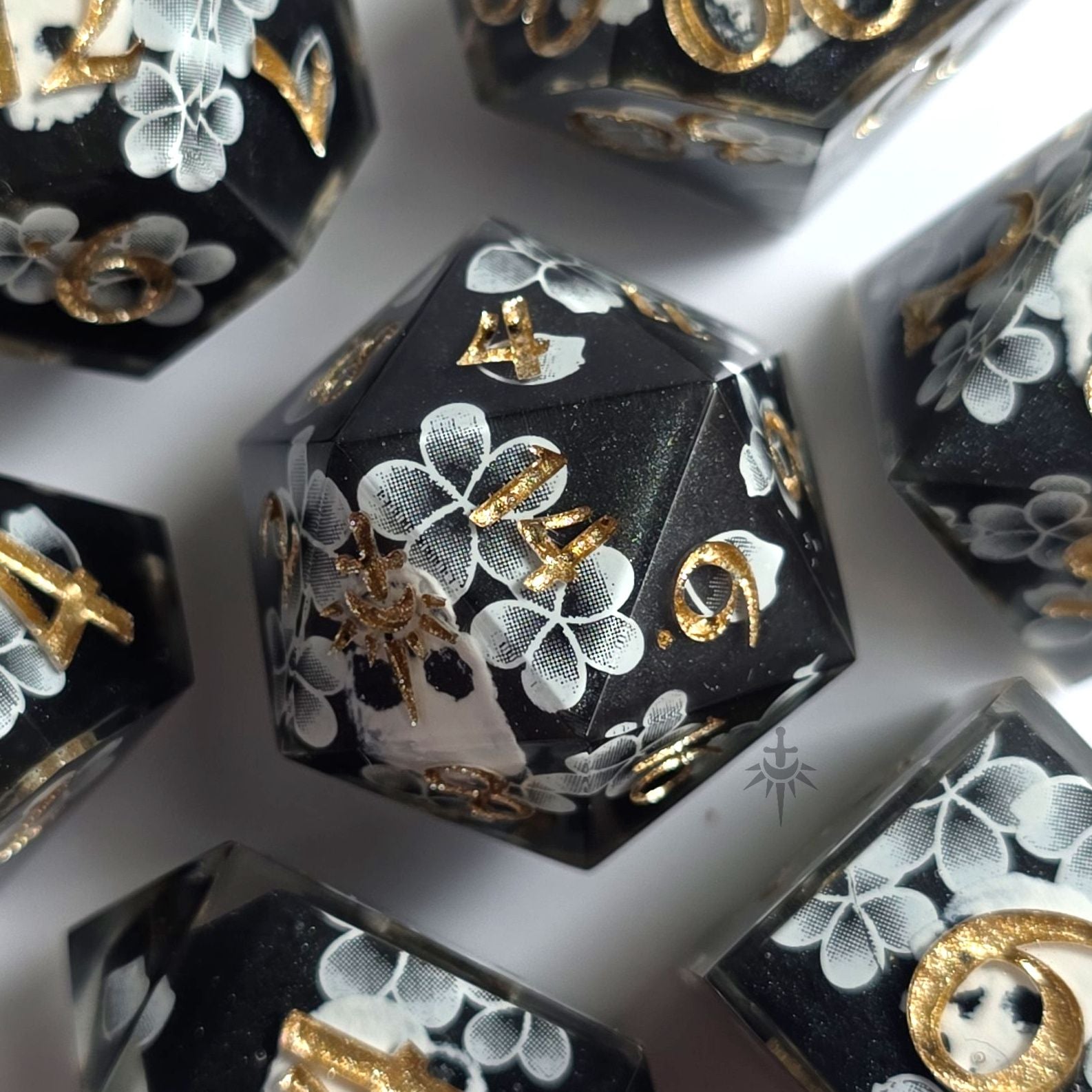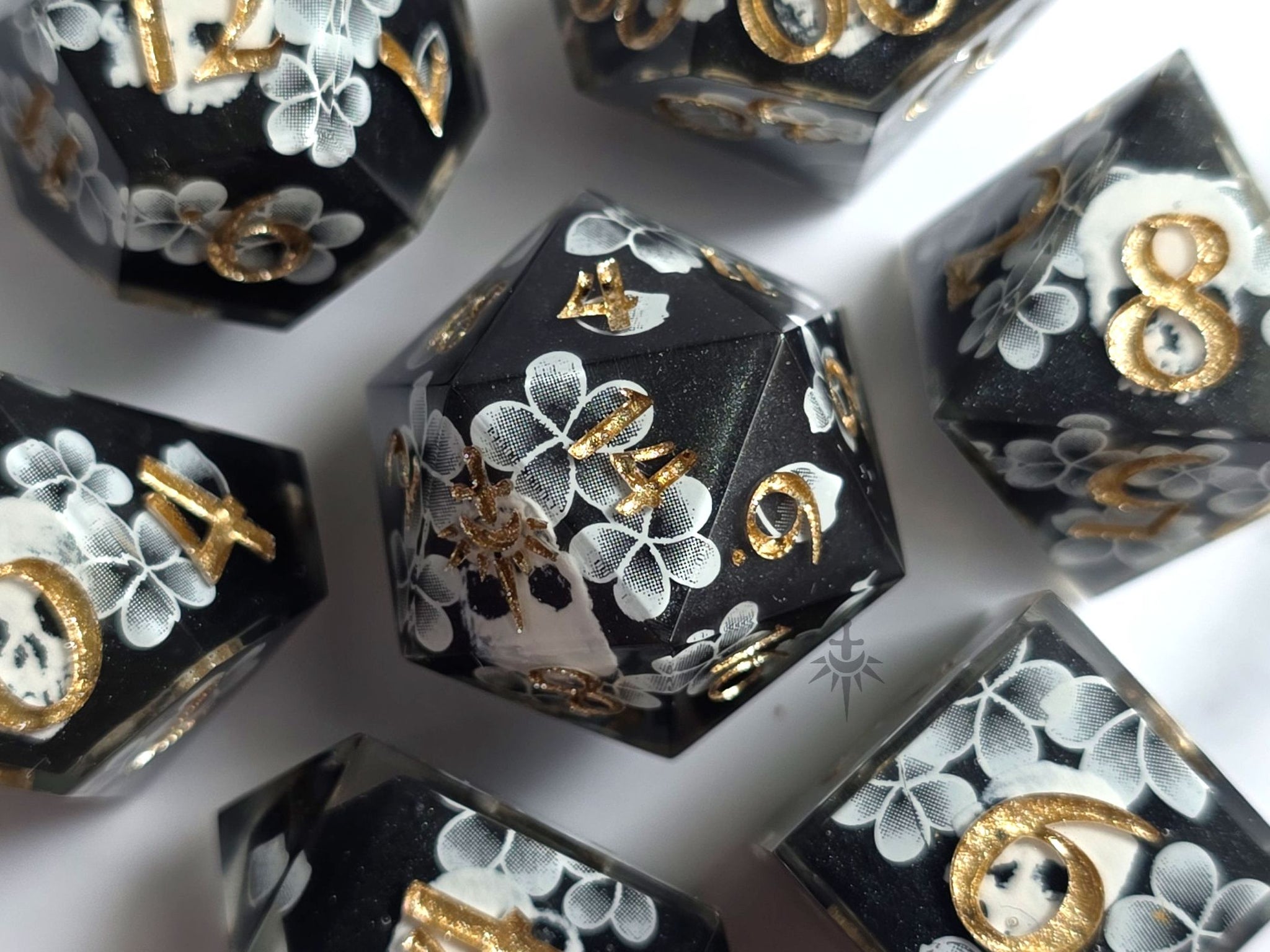 Inspired by the infamous Critical Role quote, this design features skull decals on the high and low faces with eerie, ghost-like flowers and petals spanning the remainder of the black base. Finished in a champagne gold ink.