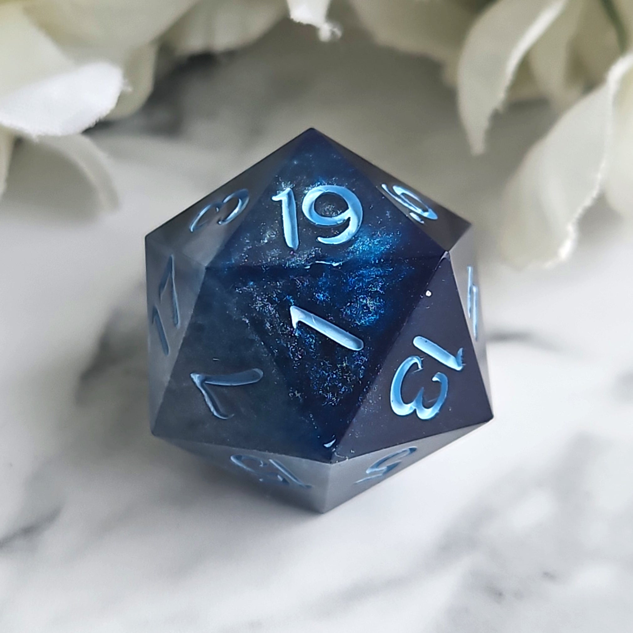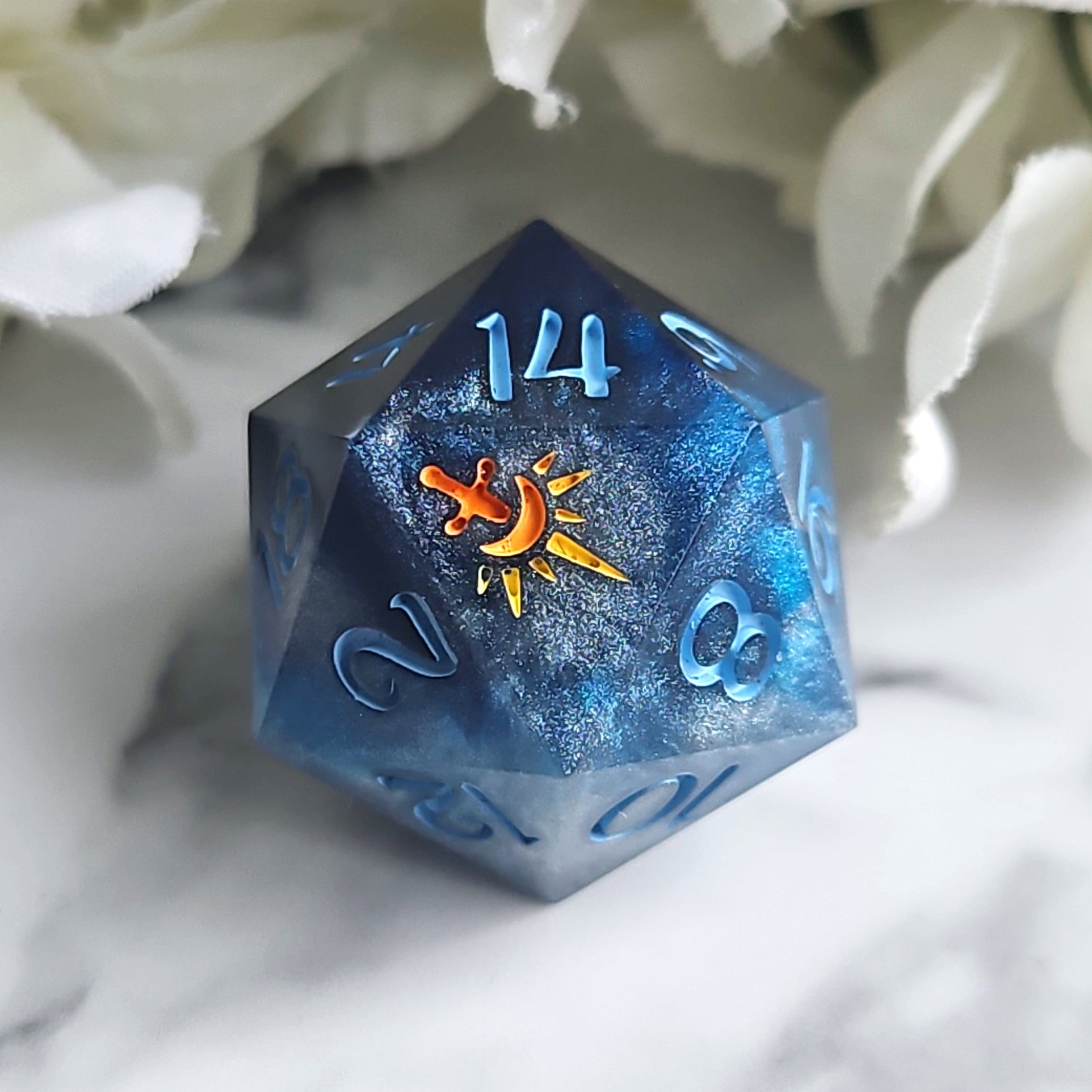 This design was inspired by Robbie Daymond’s character Dorian Storm from Critical Role’s Campaign 3 (and Exandria Unlimited series). It features swirling midnight and steel blue pigments with metallic silver veins throughout, and it is finished in a matte blue ink with ombre sunset shades on the high faces.