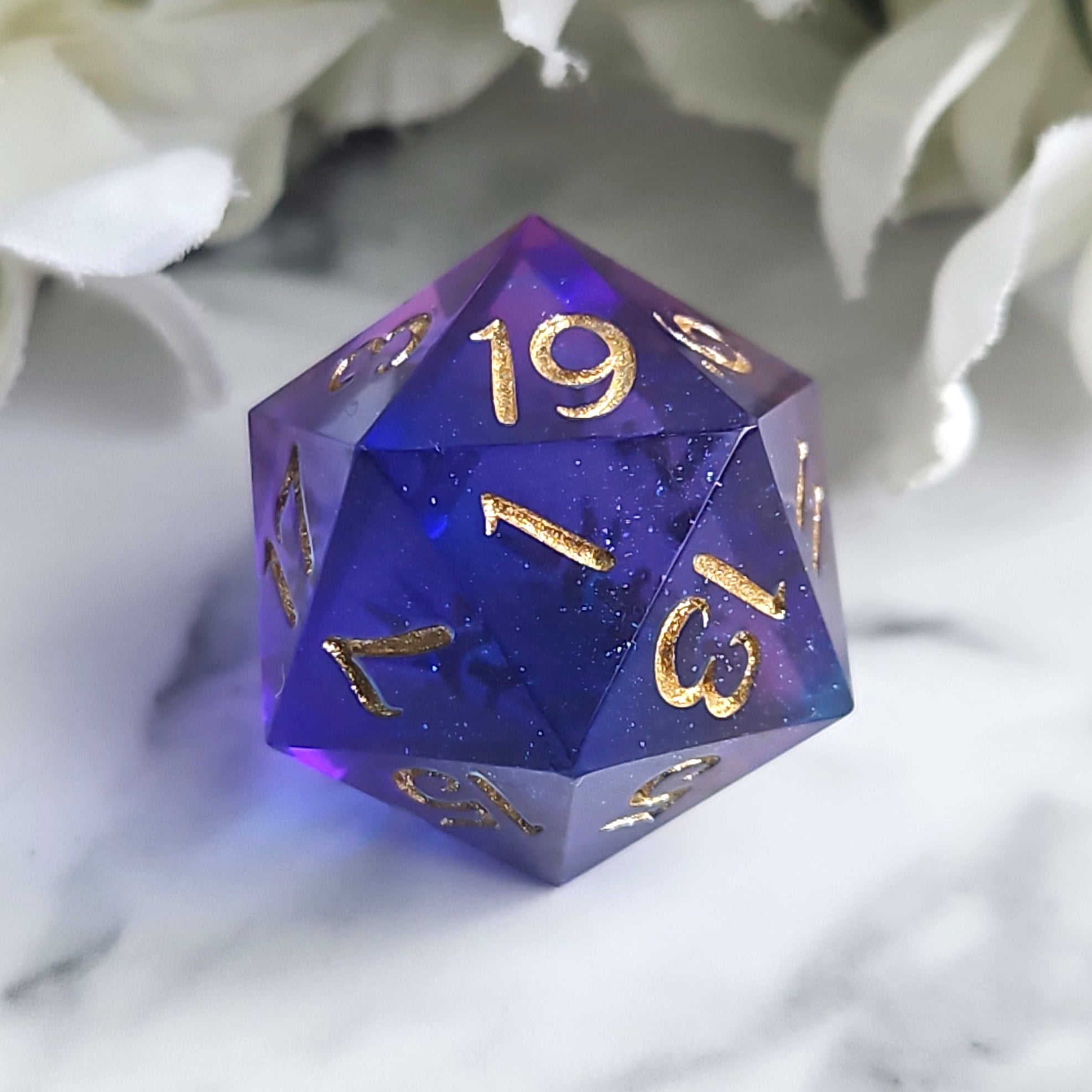 Translucent shades of vibrant purple, hot pink and electric blue tangle together in this retro-style dirty pour design. Laced with a subtle shimmer throughout and meticulously finished with an ombre orange to yellow ink on each high face with a bright champagne gold on the remaining numbers.